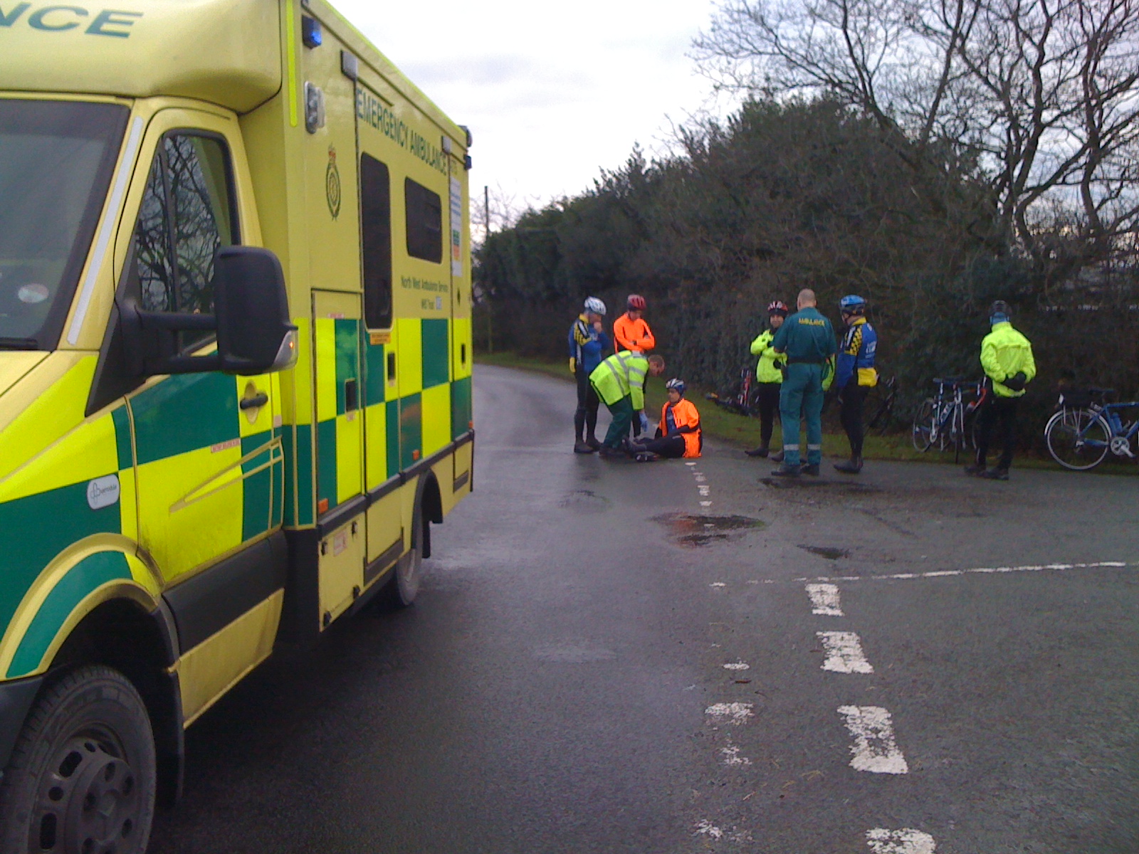 The other group arrive and quickly Phil Jones calls for an ambulance and within a few minutes there she is coming to my rescue and I feel slightly cheerier knowing I will be soon taken care of. Somebody mentions my bike but I don't particularly care about it, I'm in a world of my own. As the ambulance men deal with me I ask Ade to take some shots for this blog just to make light of my situation and perhaps have a few shots to go with this post and then I'm whisked off on gas & oxygen.